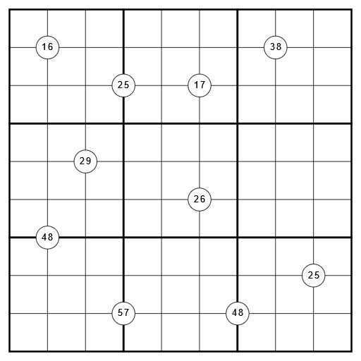 - Normal sudoku rules apply, i.e. each row, column and 3x3 region has to contain the digits from 1 to 9 once each.