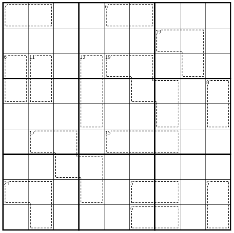 Killer: Digits may not repeat within a cage and must sum to the total in the top left corner of the cage.