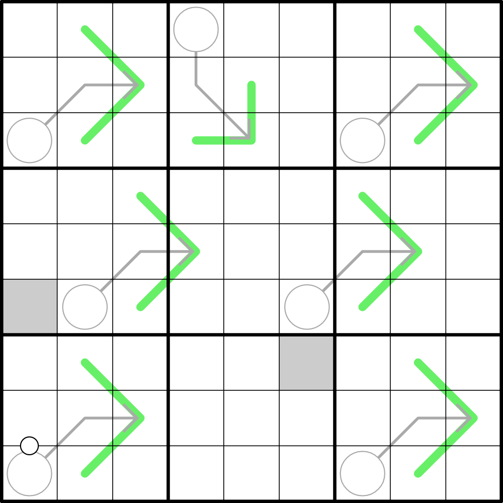 Normal sudoku rules apply. Consecutive digits along the German Whispers (green lines) must differ by at least 5. Digits along an arrow must sum up to the digit in this arrow's circle. Digits separated by a white dot must be consecutive. Digits in gray cells must be equal.