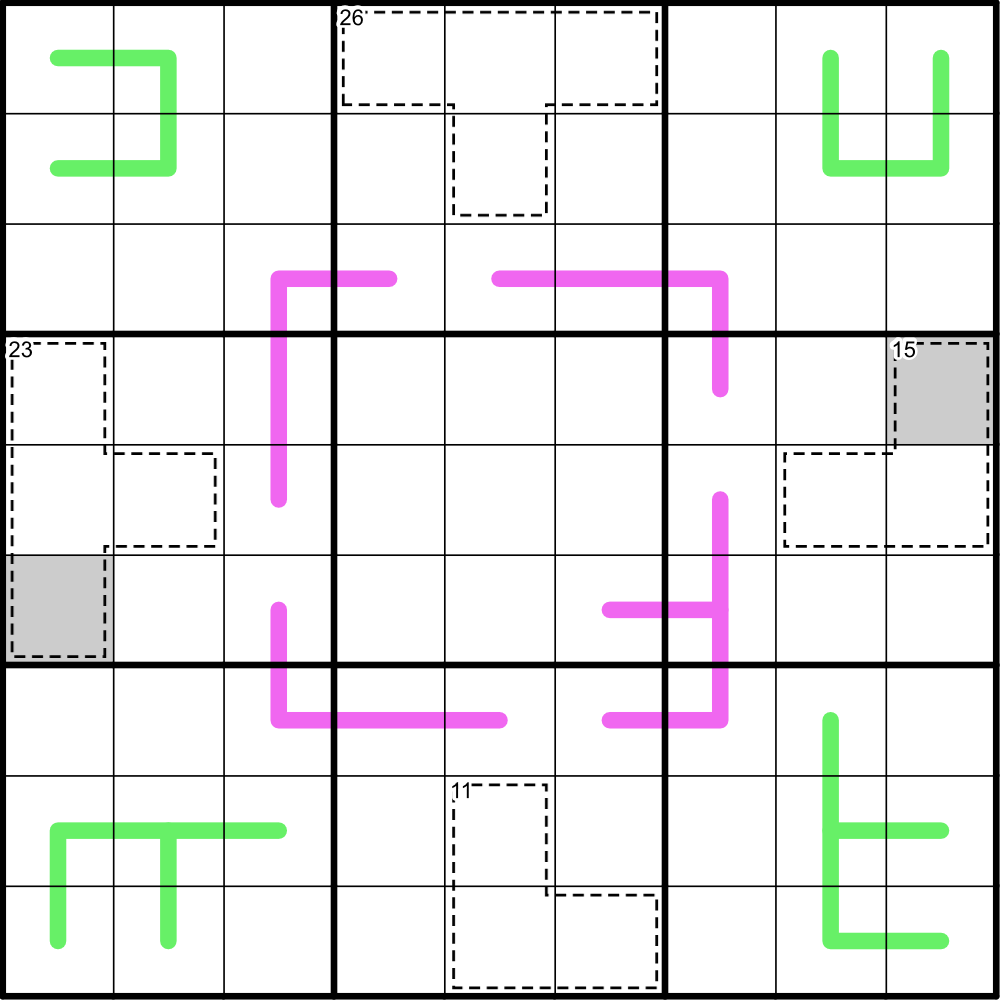 Normal sudoku rules apply. Adjacent digits along the German Whispers (green lines) must differ by at least five. Digits on a Renban (pink line) must be different and form a set of consecutive digits in any order. Digits in a cage must sum to the value in the top left corner of the cage. Digits in the grey cells must be equal.