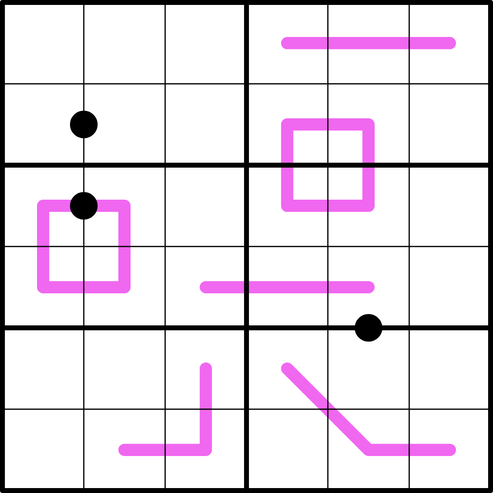 Kropki Dots: cells separated by a black dot are in a 1:2 ratio. Not all possible dots are given.