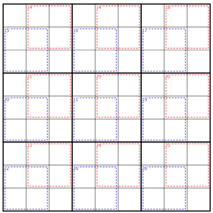 Killer cages: in cages, digits cannot repeat and sum to the number in the top-left corner. Colors are cosmetic to differentiate overlapping cages.
