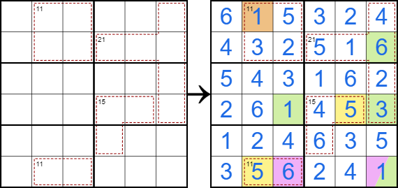 • Psycho Look-and-Say Killer Cages: Digits in cages do not repeat, and sum to the given clue (which may be shown in any cage cell). The cage clue is also read as a look-and-say clue that counts the exact number of times a target digit is indexed from the cage. A caged digit's indexed cell is located in the box of the digit's number, in the same position within the box as the original cell containing the digit. A digit may index its own cell. Usual box numbering applies.