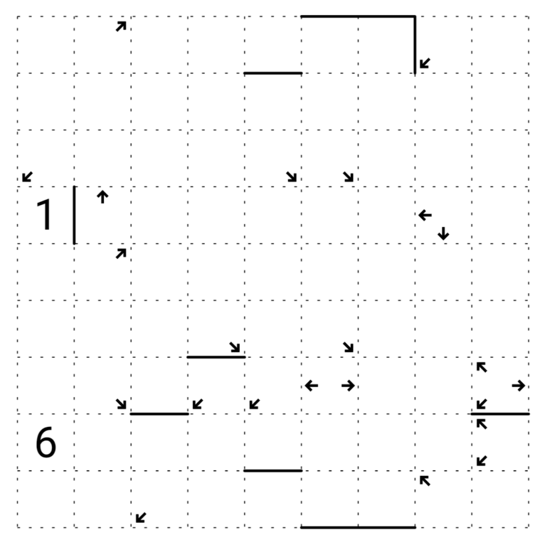 - Arrows: The number in a cell with an arrow is the sum of cells seen in that direction from the same region as the first seen cell. Cells from a different region than the first seen cell block vision. The arrow may be in the same region as the summed cells. If a cell contains multiple arrows, sum each direction separately.