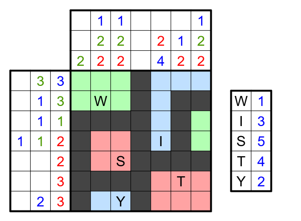 In addition, each unshaded (i.e, non-canal) region must be colored entirely as a single color selected from red, green, or blue. The clues outside the grid indicate the number of orthogonally connected unshaded cells of the respective color(s) in that row or column, they can not be 0 or double digits, and contiguous runs of same coloured cells have to be separated by at least one shaded cell.