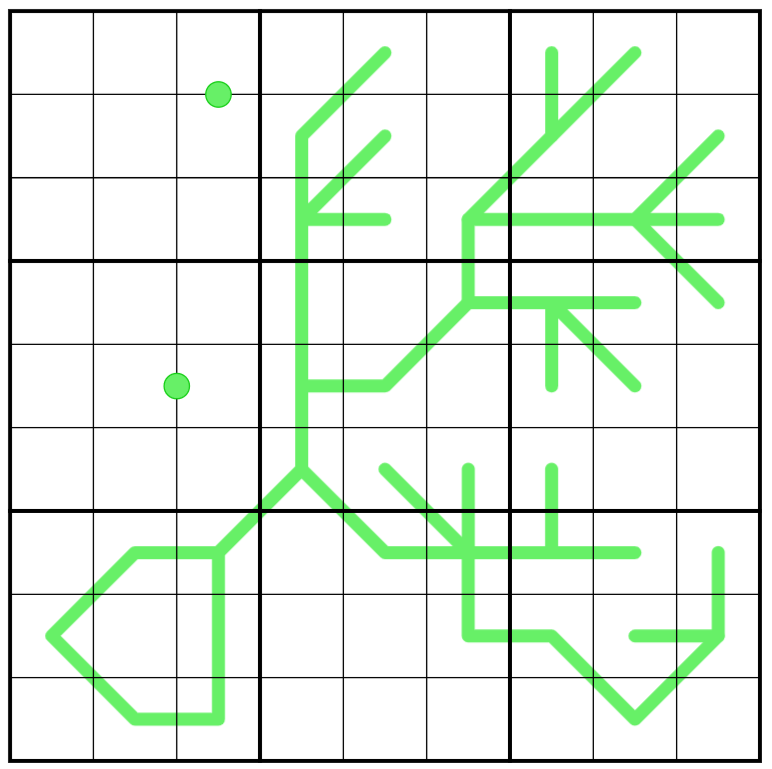 3. Green Dots: Digits joined by a green dot must be in a 1:N ratio where N is an integer, i.e., one of the digits is a multiple of the other. Different dots may have different ratios. Not all possible dots are given.