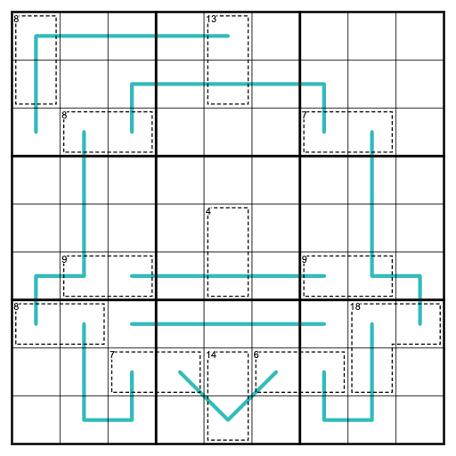 Cages: Digits in cages cannot repeat and must sum to the value shown in the upper left corner of the cage.