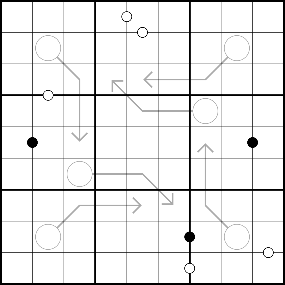 Kropki Dots: Digits seperated by a black dot are in a 1:2 ratio (i.e. one is double the other). Digits seperated by a white dot are consecutive. Not all dots are necessarily given.