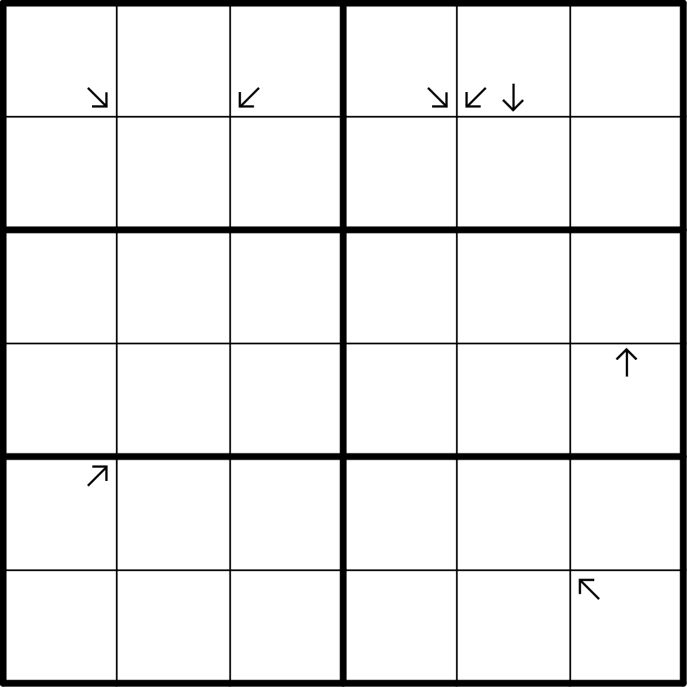 Cells with arrows in them are internal skyscraper clues. They give the amount of cells seen in the direction of the arrow. Greater or equal digits obstruct the view. The digit itself does not count towards the arrow's direction. Each arrow is counted separately, for example, if r1c5 is 2 then from this cell 2 digits have to be seen both in the diagonal and vertical directions.