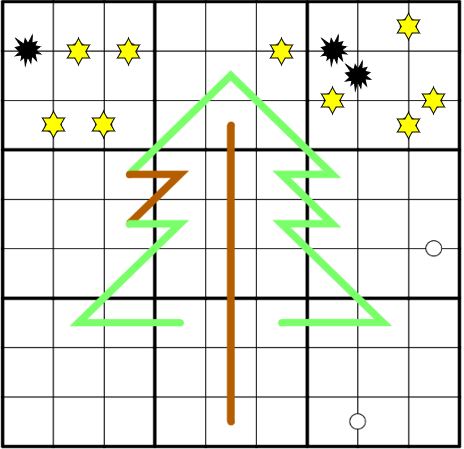 Kropki: Cells linked with a yellow star or white dot are consecutive. Cells linked with a black star have a ratio of 1:2. Not all possible stars / dots are given.