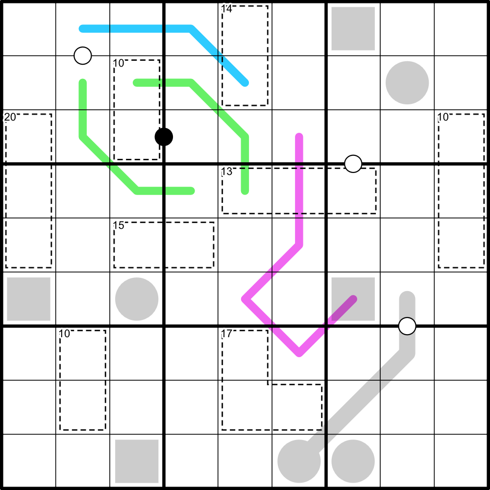 RULES: Normal Sudoku rules apply. Normal German whisper rules apply. Normal region sum line rules apply. Normal Renban line rules apply. Digits in grey circles are odd. Digits in grey squares are even. Digits in cages sum to the small total. Digits may not repeat in cages. Slow thermometer rules apply. Digits separated by black dots are in a 1:2 ratio. Digits separated by white dot are consecutive. Not all black or white dots are given.