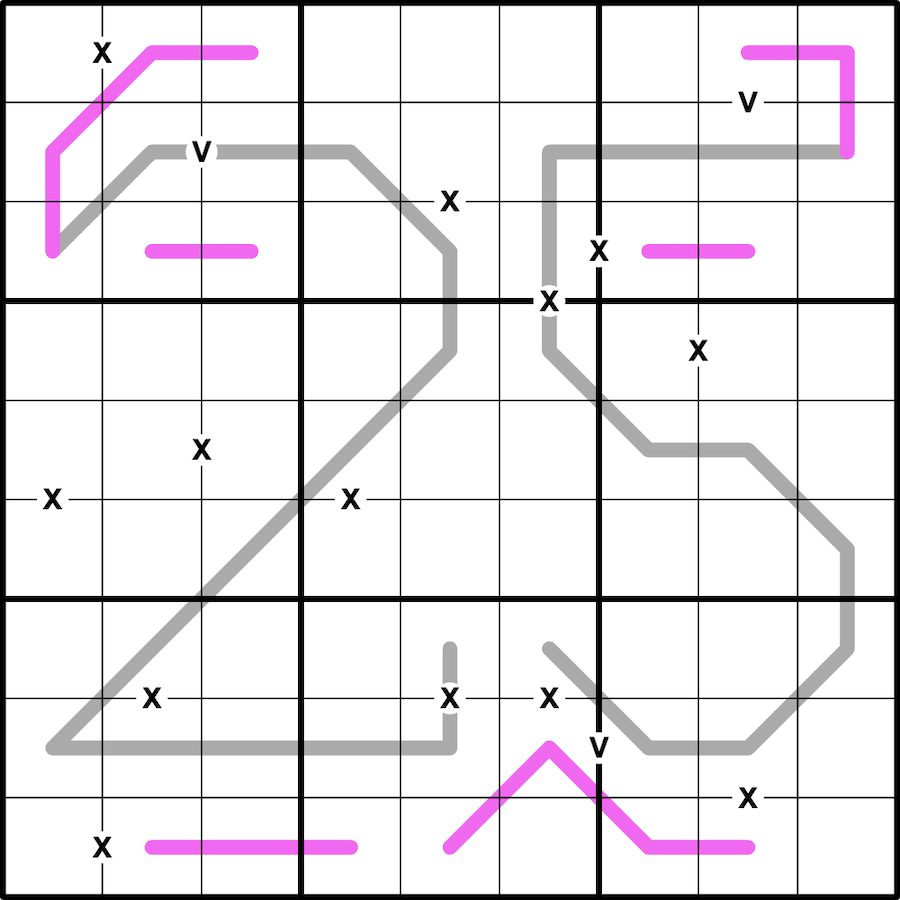 Cells separated by an X must sum to 10. Cells separated by a V must sum to 5. Not all Xs and Vs are necessarily given (no negative constraint).
