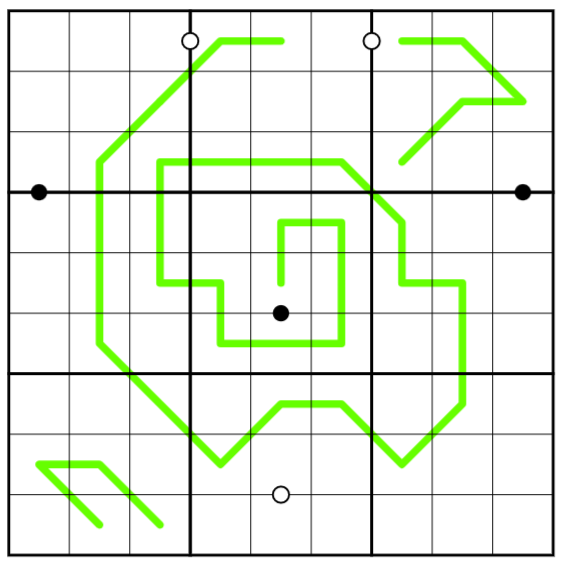 Green lines are German Whispers, where adjacent cells on the line must have a difference of at least 5.