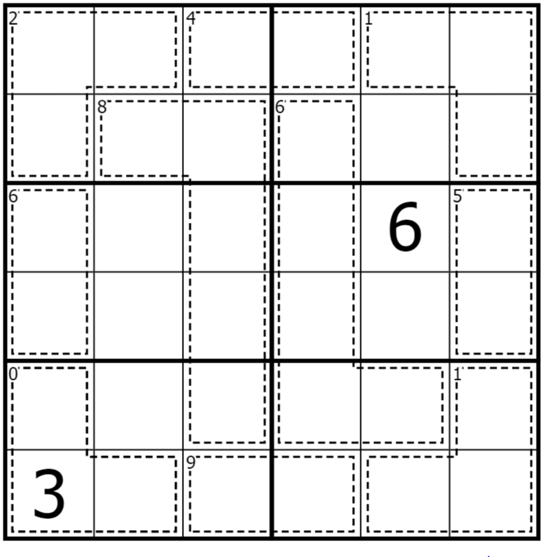 Normal Mini Sudoku rules apply (each row, column, and given 2x3 box must contain the digits 1 to 6).