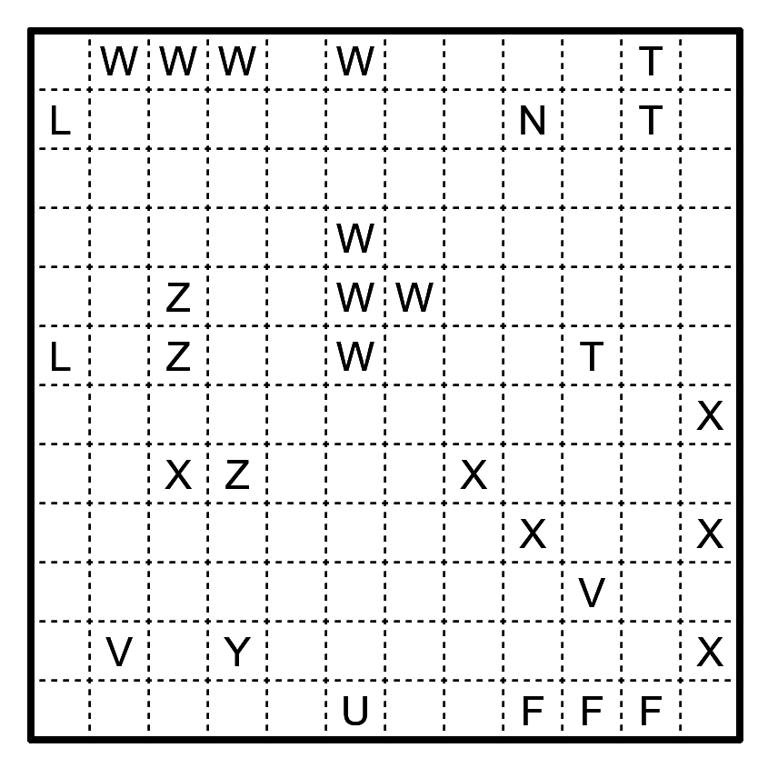 Pentominous: Divide the subgrid into pentominoes (5-cell regions). Pentominoes of the same shape cannot be orthogonally adjacent, counting rotations/reflections as the same. Letters indicate the shape of the pentomino they belong to. Pentominoes may contain any number of letter clues.