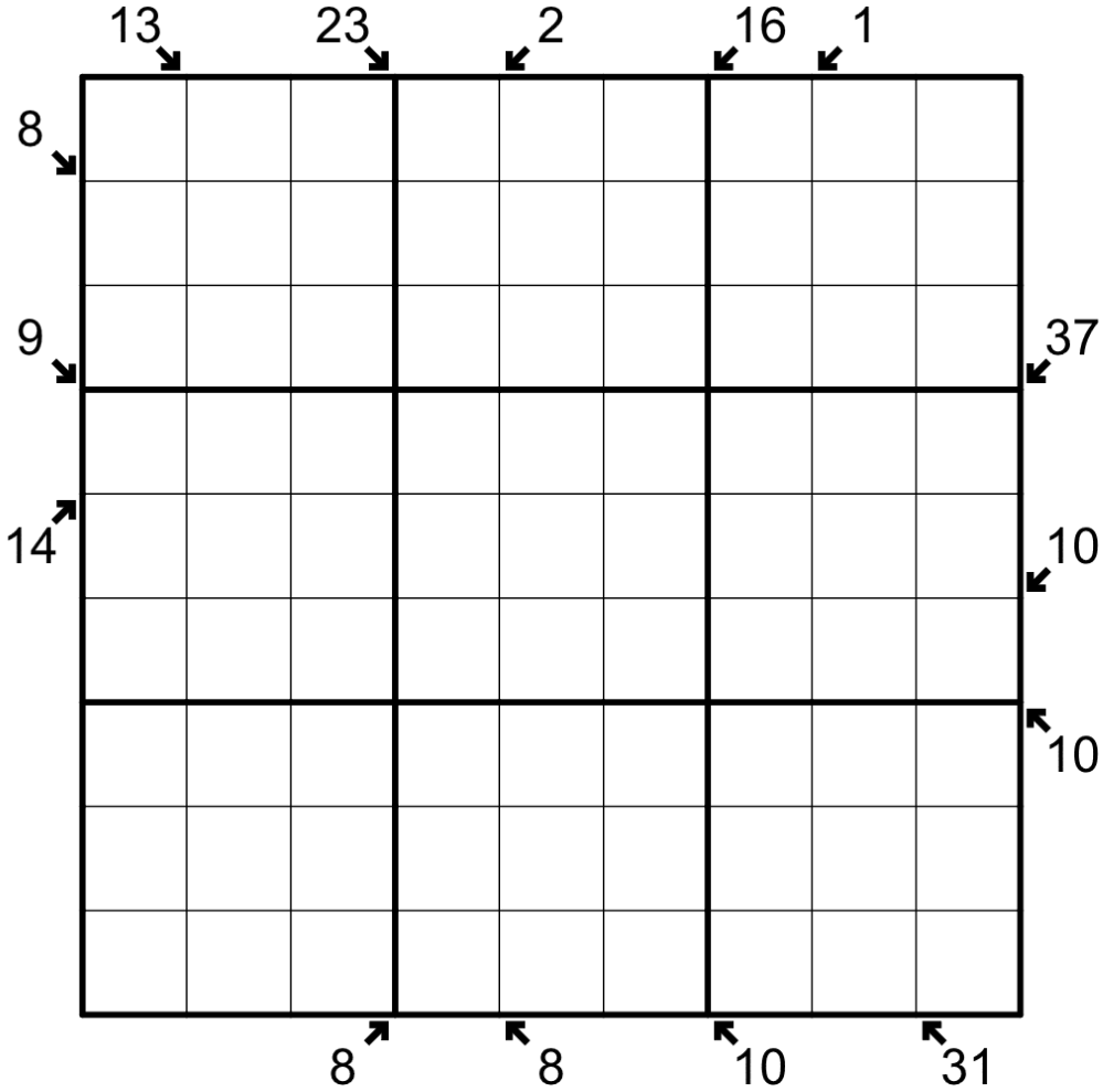 - Diagonal X-Sum or Sandwich: Each clue outside the grid is either a Sandwich clue (giving the sum of the digits sandwiched between the highest and lowest digit) or an X-Sum clue (giving the sum of the first X digits in the indicated direction, where X is the first digit seen in that direction) along the indicated diagonal. Which clues are which must be deduced.