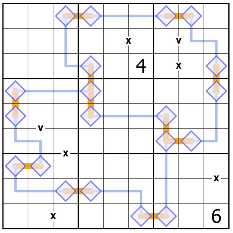 #4 Digits in cells separated by a V must sum to 5. Digits in cells separated by an X must sum to 10.