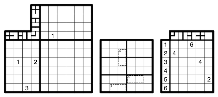 The second diagram is a 6x6 killer sudoku. Place the numbers from 1 to 6 exactly once in every row, column, and bold outlined region. An area enclosed by a dashed line is called a killer cage. Numbers in a killer cage must be different and sum to the number in the upper-left corner of the cage.