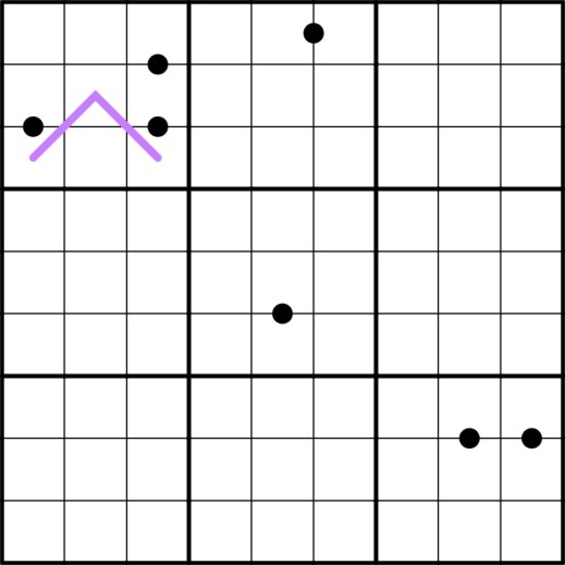 Normal Sudoku Rules apply. CELLS ON THE GRID ARE SUPER INDEXED- Except for some special cases, where cells are indexed to themselves, cells are each connected to 2 other cells in the grid, found by switching row, column and digit. Example: If row 7, column 2 is the digit 4, then row 2 column 4 is the digit 7 AND row 4 column 7 is the digit 2 (7,2,4 > 2,4,7 > 4,7,2). An example of a self-referenced cell is if row 1, column 1, contains the digit 1. KROPKI PAIRS- Numbers with a black dot between them are in a ratio of 2:1. Not all dots are given. PURPLE LINE- Neighbors on a purple line are consecutive. HINT: A property of a super indexed puzzle is- Within ALL boxes, the low numbers (1,2,3) must each be in different columns and rows than one another. The same is true for the middle (4,5,6) and the high (7,8,9) numbers.