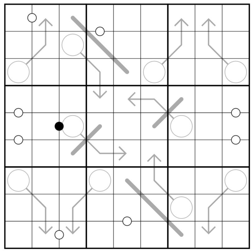 - Digits separated by a white dot are consecutive, digits separated by a black dot are in a 1:2 ratio, ie. one digit is double the other. Not all dots are given