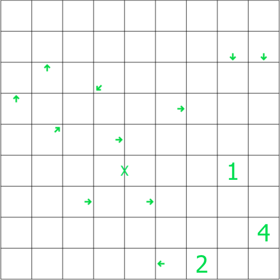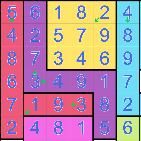 Green Arrows: The digit in a cell with an arrow is the total number of OTHER cells belonging to the same region seen in the indicated direction by the arrow in the cell. Entering different regions obstructs this vision. Additionally, each arrow's sightline, (going from its cell to the last cell it sees in its region without changing direction,) must satisfy at least one of the three below rules. No two arrows in the same region may satisfy the same rule. Note that the green X indicates that the two cells it separates are in the same region. There are also three given digits.