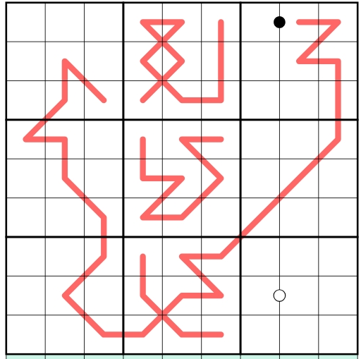 Dots are modular kropki dots: On a white dot, digits must be consecutive. On a black dot, one digit is double the other, modulo 11. E.g. if one digit on a black dot is 8, the other digit must be 4 ( because 2×4 = 8 ) or 5 ( because 2×8 = 16 = 5 + 11 = 5 (mod 11) )