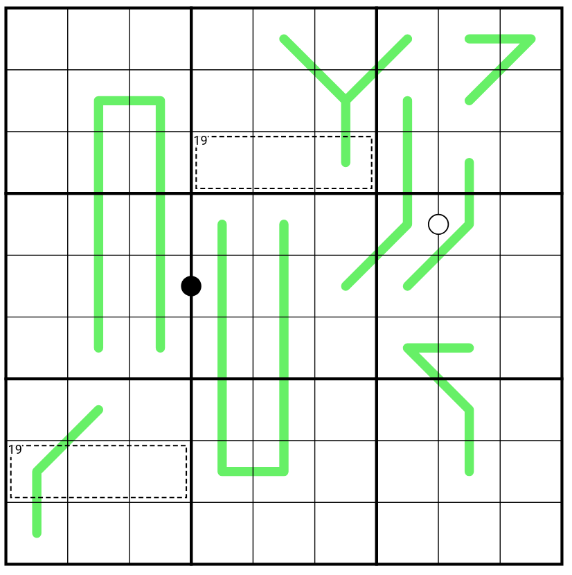 GERMAN WHISPER (GREEN): Adjacent digits along a green German Whispers line must differ by at least 5. Digits may repeat if other rules allow.