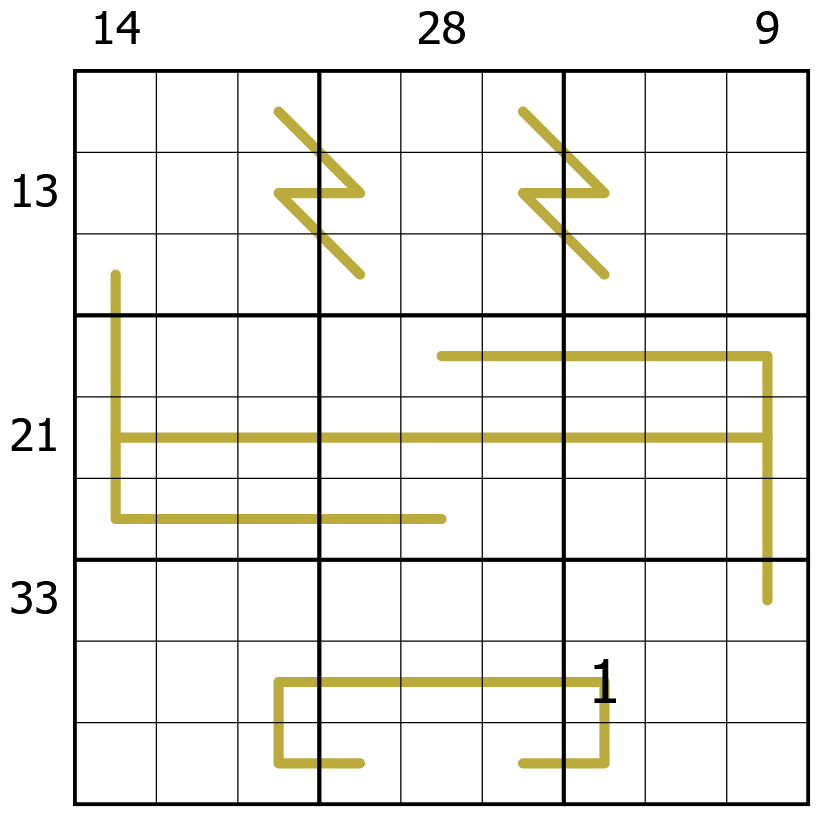 Sandwich: A clue outside the grid gives the sum of the digits appearing between the 1 and the 9 in that row/column