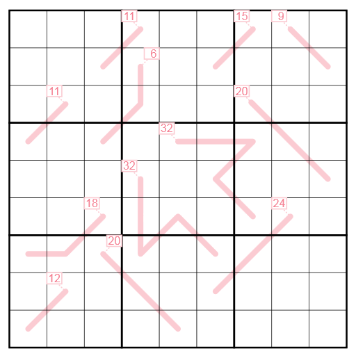 - Killer Lines: Digits on a line may not repeat and must sum to the clue attached to it.