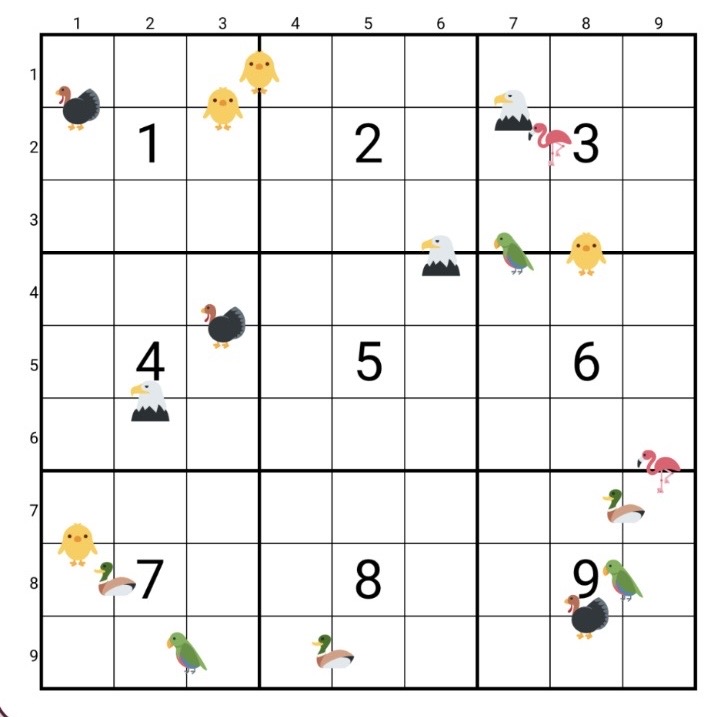 Each variety of bird designates an ornithological relation between a particular pair of orthogonally adjacent digits. For example, all pigeons might separate all the 1/2 pairs, and all peacocks might separate all the 2/3 pairs. This is only a hypothetical example. As you can see, there are no pigeons or peacocks in the grid.