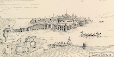 Not far from the mouth of the Forest River was the strange town he heard the elves speak of in the king's cellars. It was not built on the shore, though there were a few huts and buildings there, but right out on the surface of the lake, protected from the swirl of the entering river by a promontory of rock which formed a calm bay.