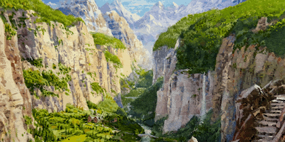 At last they came up the long road, and reached the very pass where the goblins had captured them before. But they came to that high point at morning, and looking backward they saw a white sun shining over the outstretched lands. There behind lay Mirkwood, blue in the distance, and darkly green at the nearer edge even in the spring. There far away was the Lonely Mountain on the edge of eyesight. On its highest peak snow yet unmelted was gleaming pale.