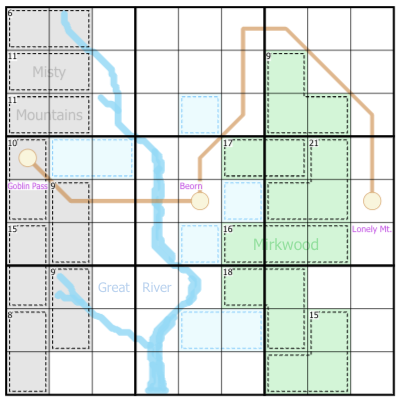 Digits along Bilbo and Gandalf's path (brown lines) must be between the digits in their journey stopping points (circled ends).