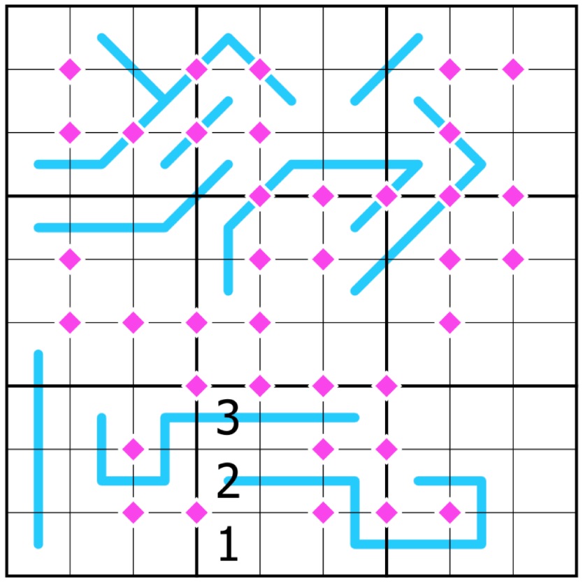 2. On ALL (yes, all) 2x2 quadrants whose digits sum to at least 20 is placed a pink diamond