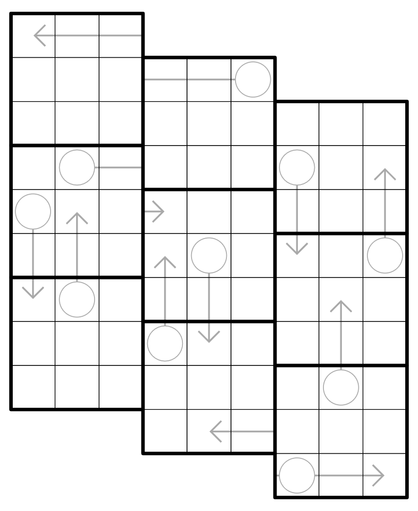 Fill the grid with digits from 1-9 so that no digit repeats in any of the 9 rows, 11 columns, or 9 boxes.