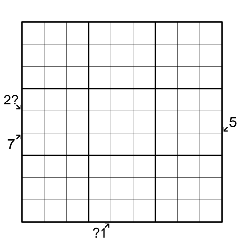 Clues outside of the grid simultaneously indicate the sum of all digits seen in their diagonal and the sum of all digits sandwiched between the digits 1-9 in their row/column.