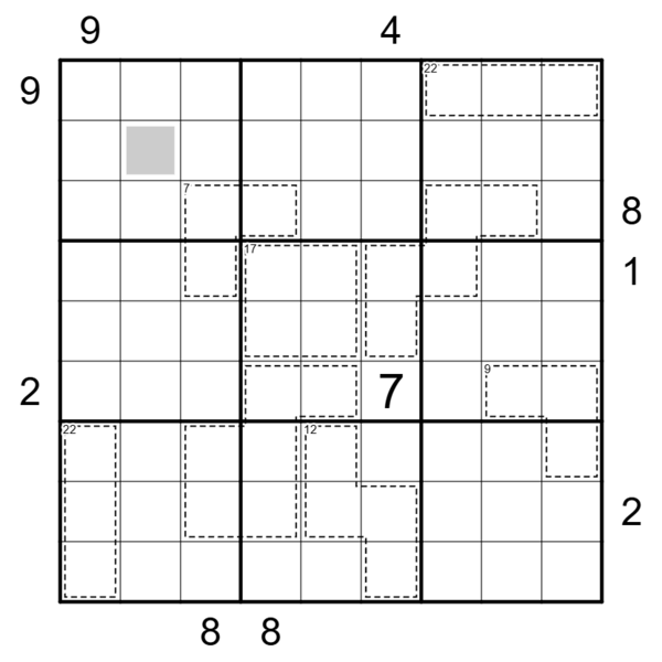 - Numbered Rooms: clues outside the grid indicate the digit which has to be placed in the Nth cell in the corresponding direction, where N is the digit placed in the first cell in that direction.