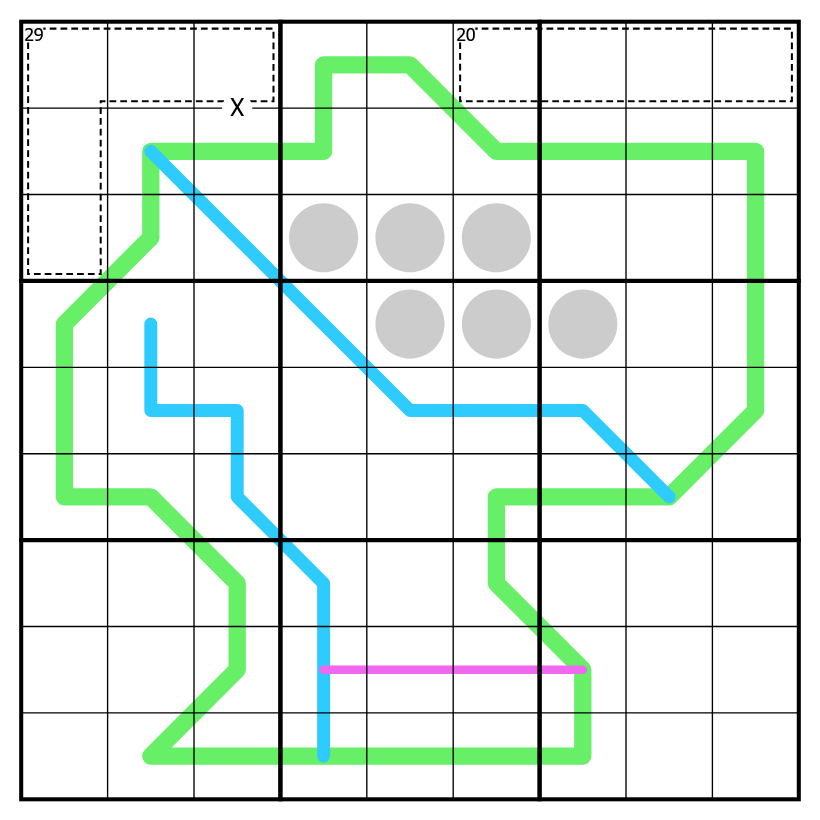 Borders-German Whispers(Thickest line): Along a green line, two adjacent digits must have a difference of at least 5.