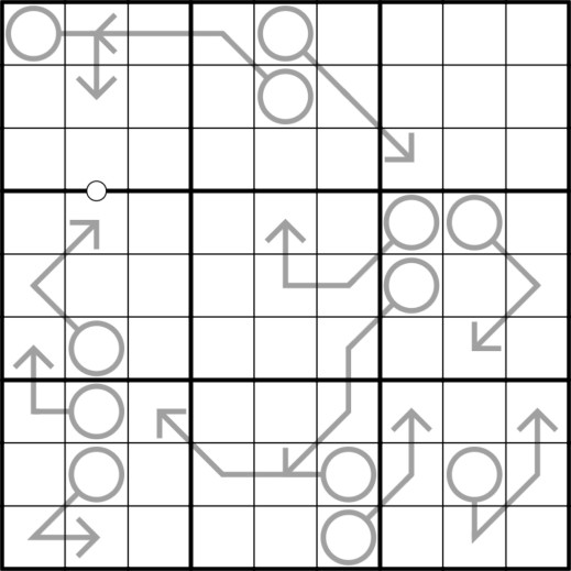 Normal Sudoku rules apply. POINTER ARROWS(+)- Numbers on arrows sum to the number in the arrow's circle. Also, arrow tips point toward another cell containing the same digit as the arrow's circle. The value in the arrow tip indicates the distance from the arrow tip to this cell. Numbers may repeat on arrows, if other rules allow. Arrow circles are always odd. KROPKI PAIR- Numbers with a white dot between them are consecutive. Not all possible dots are given.