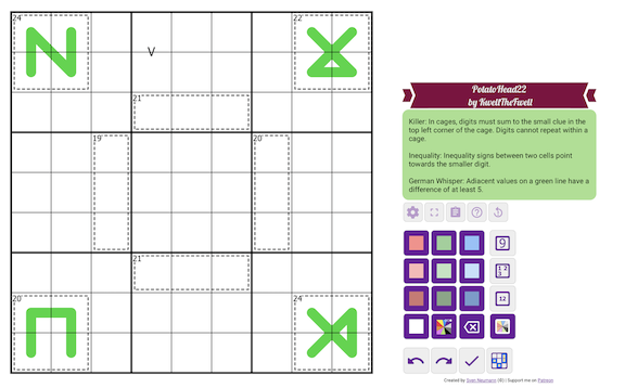Really tight coloring puzzle that required one to be super precise throughout to make progress. The logic were surely interesting, but my solve was rather slow till the end.