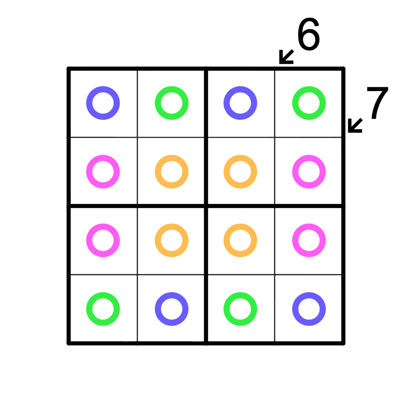 (2.) No digit may repeat on a circle of the same color. e.g. R1C1 ≠ R4C2