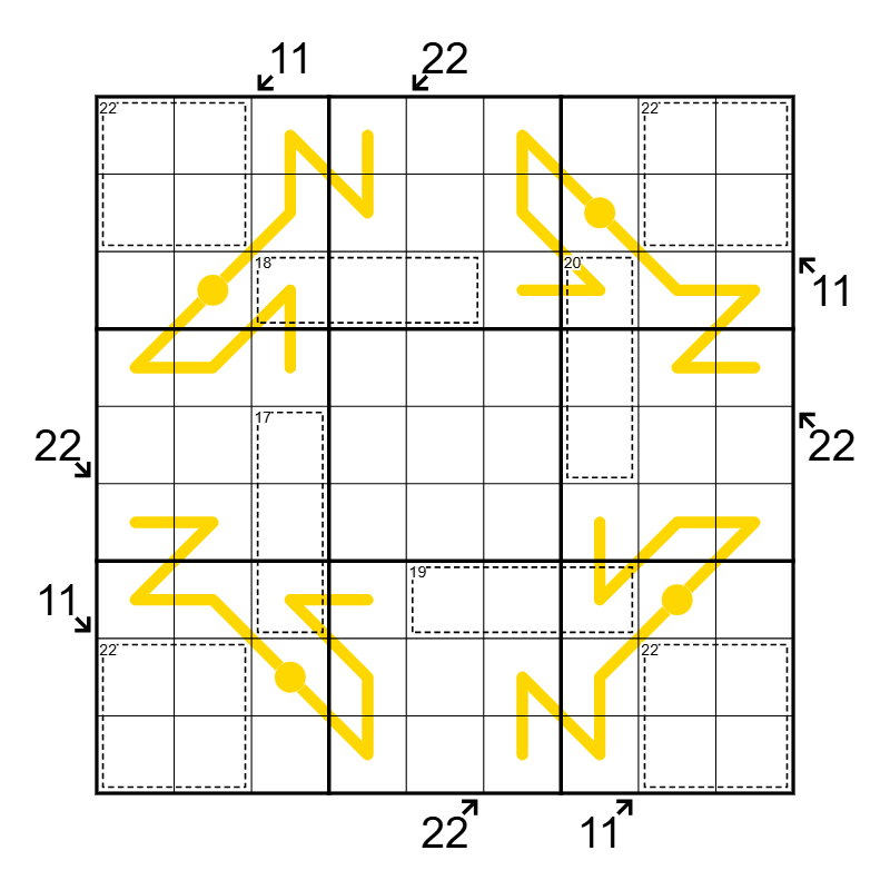 • Digits along a golden palindrome line are read the same from either direction. In addition, the central digit on the line marked by a golden circle is the same as the digit on the ends of the line.