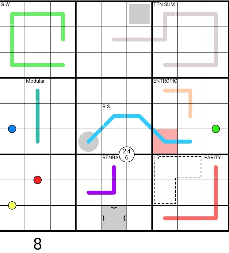 TEN SUM LINE (Tan Line): Digits along the line create one or more contagious groupings of digits that sum to ten. No groupings overlap.