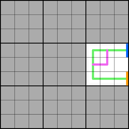 • Portals of the same colour are linked (i.e., blue to blue and orange to orange). These portals connect exactly two cells together, with other constraints being able to traverse these portals.