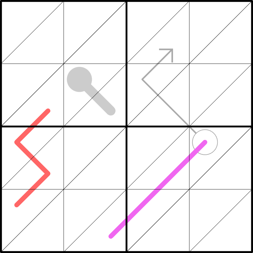 • Normal Sudoku rules apply twice. The grid looks like a normal 4×4 Sudoku. However, each cell is divided by a diagonal from bottom-left to top-right, forming two triangular halves. Each triangular half contains its own digit. The lower triangles together form a complete Sudoku (rows, columns and 2×2 boxes must each contain the digits 1–4 exactly once). The upper triangles also form a separate, independent Sudoku with the same rules.
