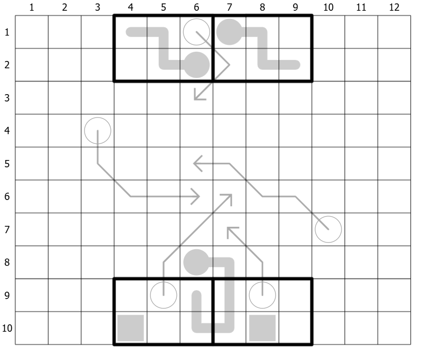 • Outside the regions, select 12 cells to form a bridge. These 12 cells must be connected as one single group and must link the two banks, with connection via orthogonal adjacency.