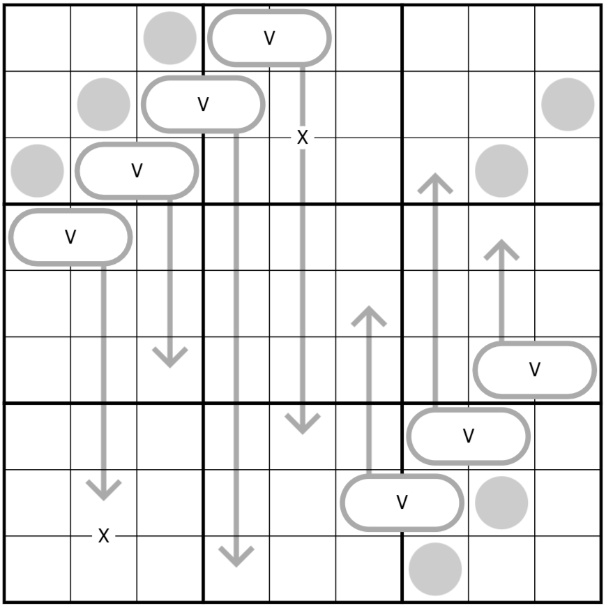 • XV Pairs: Digits in cells separated by a V sum to 5. Digits in cells separated by an X sum to 10. Not all possible Xs and Vs are necessarily given.