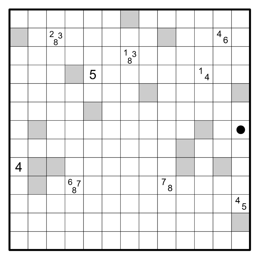 - A clued cell must have a clue for each permit adjacent to it, and each permit must be clued by at least one number clue.