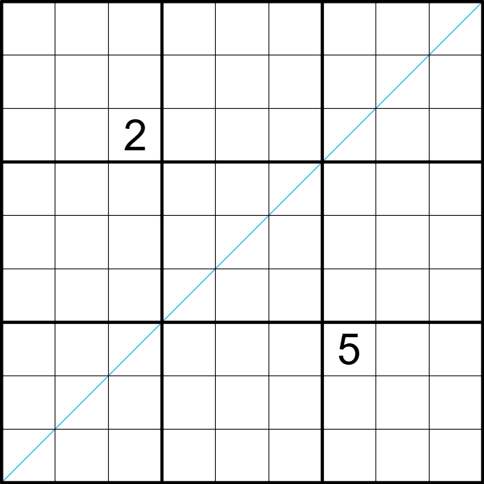 Rules: Normal sudoku rules apply. Digits cannot repeat along the marked diagonal.