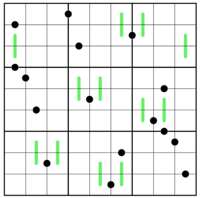 Ratio Pairs: Digits separated by a black dot must be in a 2:1 ratio. All black dots have been given.